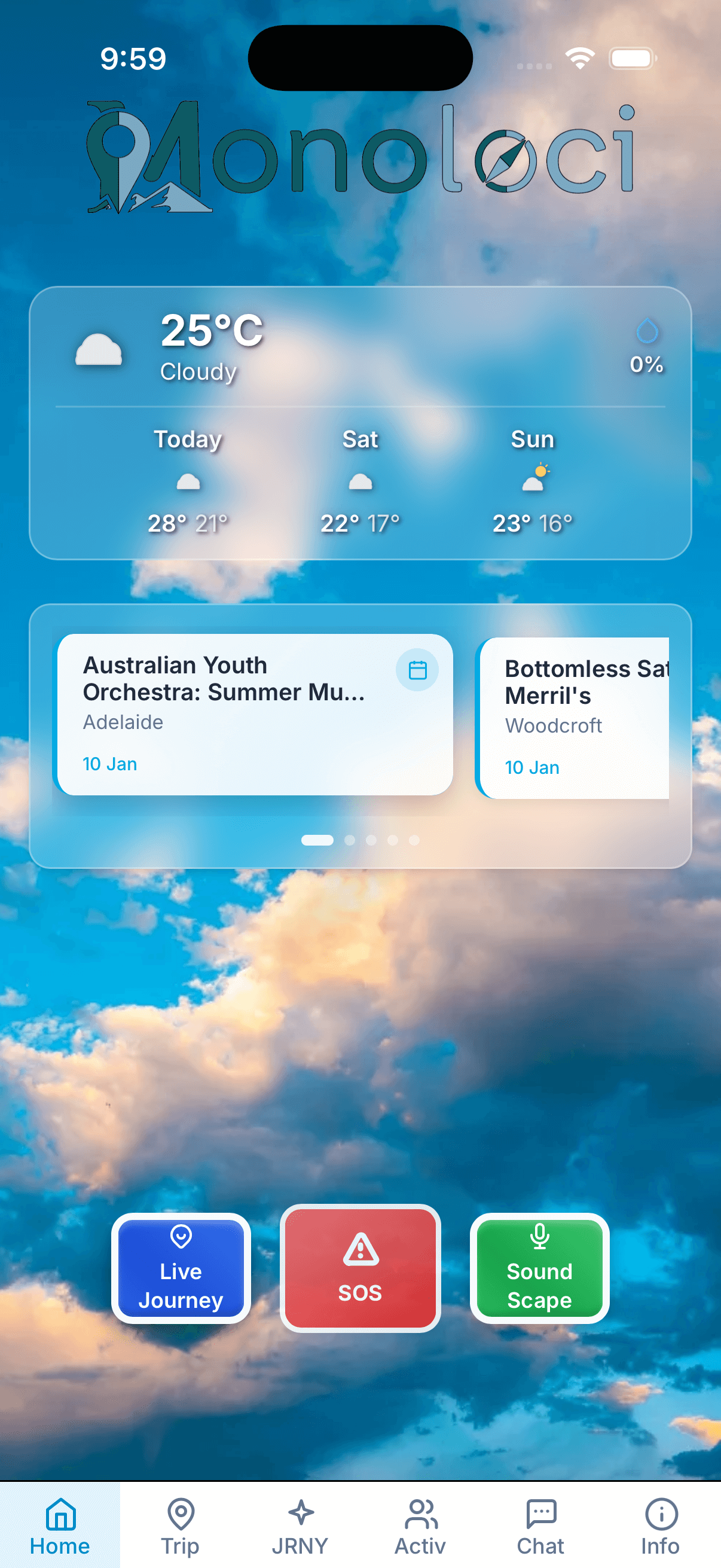 The Monoloci app is a safety focused tool that can assist if one finds themselves in an emergency, especially when out and about as a solo tourist in a new location. We built the home screen with a big SOS button which, when pushed, offers options to call 000, or send a text with predefined message to a per-selected contact along with sending a google maps link of your exact location. Having these SOS features easily accessible reduces user friction with enhanced sending times for quick emergency response.