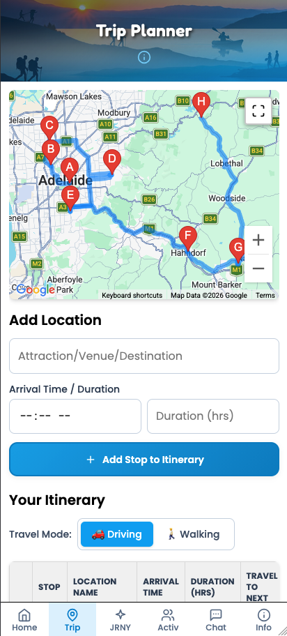 For paid activities and tours an activity code (provided by the operator) is entered opening the Activity Portal to access information, document sharing, group chat and group photo sharing.